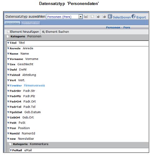 Die Gliederung eines Datensatztypes sowie die funktionellen Verknüpfungen von Datenfeldern erfolgt in der 'Felddefinition'.