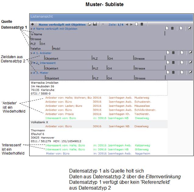 Sublisten werden genauso wie flache Listen erstellt, mit der Besonderheit, das mit Verknüpfungsarten gearbeitet wird, um Dateninhalte fremder Datensatztypen anzuzeigen.